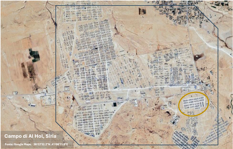 Campo di detenzione di Al Hol, Siria – Questo è uno dei campi di detenzione più grande, per dimensioni e numero di detenuti, tra quelli che ospitano i membri dell’ISIS e le rispettive famiglie. L’estensione è di circa 4 kmq, circa 560 campi di calcio a 11. È diviso in diverse zone in cui sono disposte migliaia di tende e poche strutture in muratura, tutto recintato da mura e torri di controllo.