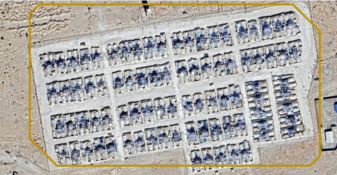 Focus sulle tende di un settore del campo di Al Hol, in cui si riesce a distinguere il perimetro e la torretta di guardia, la disposizione e le dimensioni delle tende.