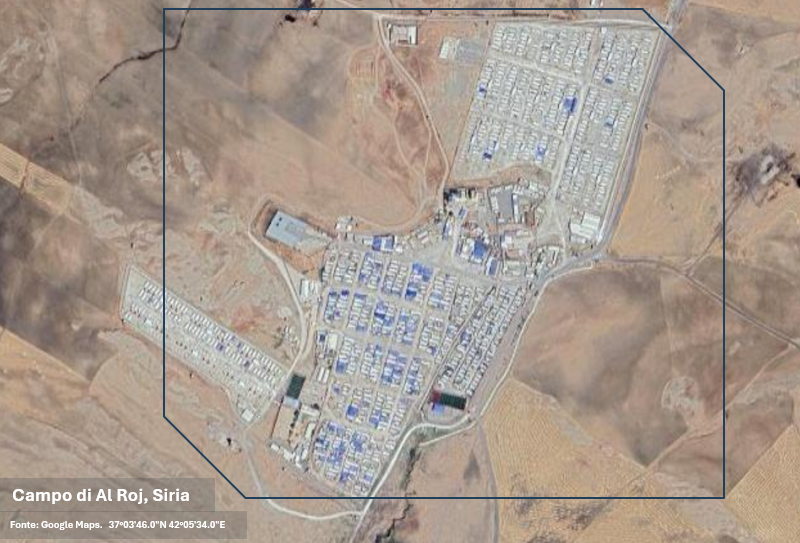 Campo di detenzione di Al Roj, Siria – L’estensione del campo è di circa 0,23 kmq (oltre 200 mila metri quadrati), che corrisponde circa al 5% dell’estensione del campo di Al-Hol.